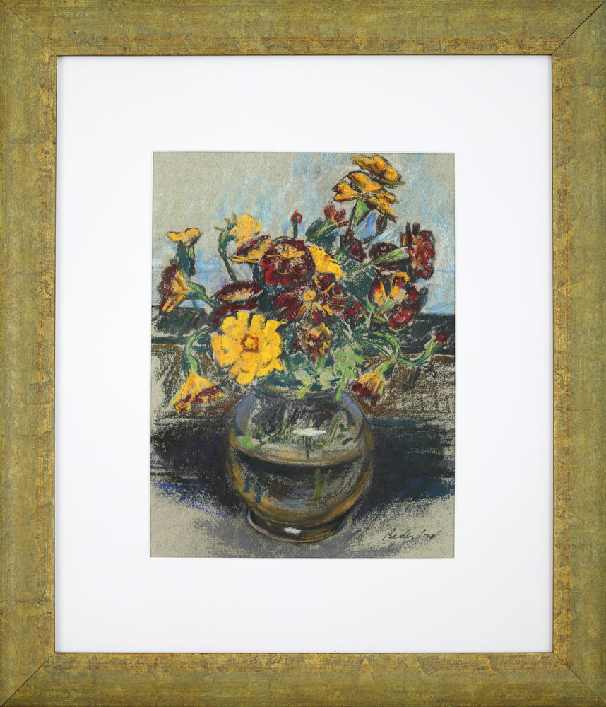 During the 1970s, Jack Beder turned to still life and floral subjects as illness and cold winters forced him to stop his outdoor work. Marigolds in Glass Jar (1970) reflects this period of his life. The pastel medium provides a soft, luminous quality, giving the flowers a velvety richness.