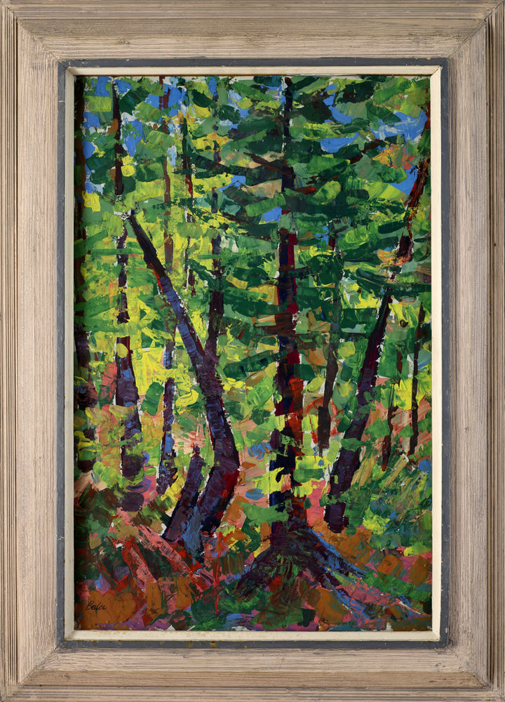 Laurentian Woods by Jack Beder is a 20 x 13 gouache acquired directly from the estate. What is portrayed as coniferous trees from the straight, tall growing trees that have dark green needles. The ancient trees that date back over 300 million years can be pointed as the subject matter of Laurentian woods. The high elevation of the tree crowns gives more perspective to the tree trunks and how it elevates the eyes upward. With vibrant colours everywhere, sprawling from the south points towards west and east are two tree trunks highlighted with light blue, with apple and forest green needles. The impasto technique, using dabs of paint and prioritizing the texture of fine detailing of the needles compliments the bold colours of this piece. With sunlight coming through the needles, we see the play of shadows and highlights with coral and amber red colouring surfacing the forest floor.