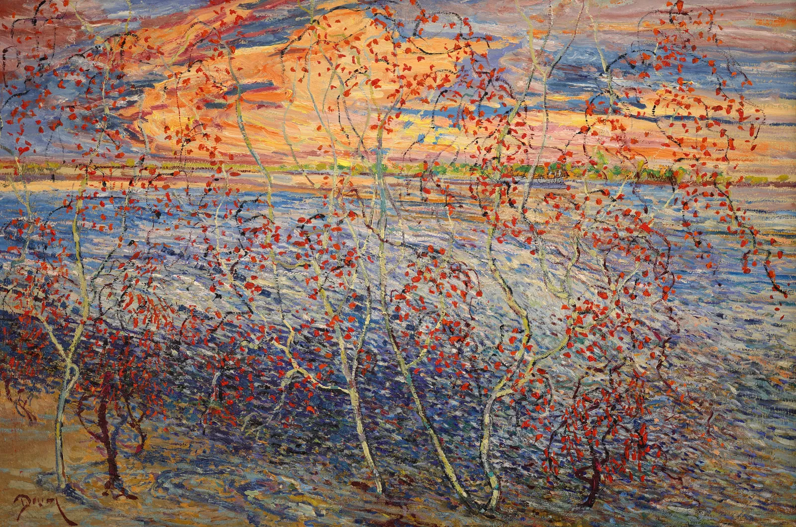 The background, in contrast, is a tapestry of serene blues and gentle lavenders, suggesting the coolness of an autumn sky and the stillness of the water beyond. This tranquil expanse serves as the perfect foil to the exuberant display in the foreground. The horizon is marked by a thin, glowing strip of warm color that mirrors the fiery tones of the leaves, suggesting the setting sun's reflection on the water's surface.