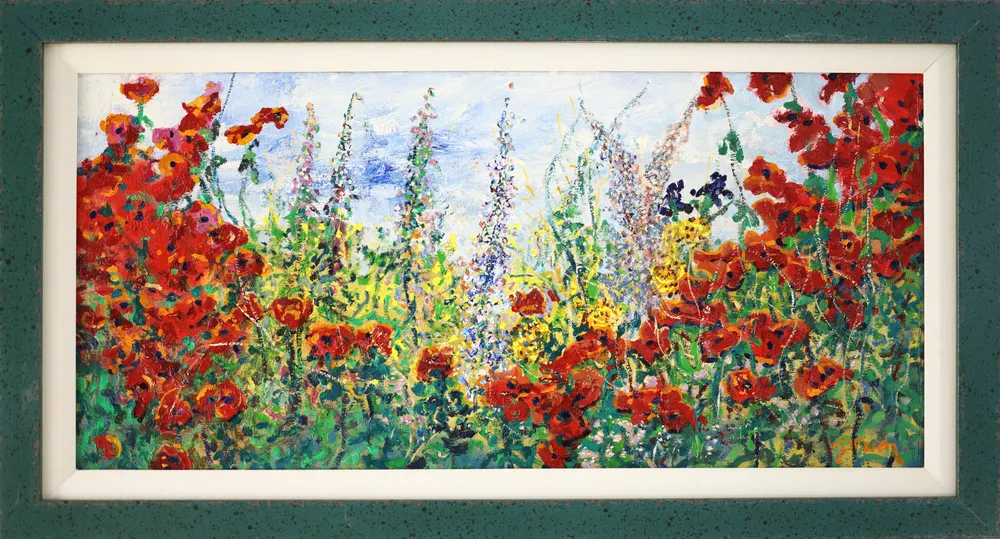 Poppies in Full Bloom by David Drum is a 12 x 29 inch oil on canvas produced in 2024 and signed in the bottom right corner. The painting depicts a vibrant garden bed as seen from eye level. Bright red poppies fill the composition on either side while a medley of wildflowers can be seen further off into the distance. Drum uses bold, saturated colours and layered brushstrokes to create this cheerful, floral landscape which comes to Rookleys directly from his Crystal Beach Studio.