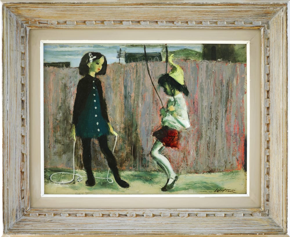 William Winter’s Skipping portrays two young girls immersed in a quiet moment of outdoor activity. One stands pensively with a skipping rope, her dark dress and pale face contrasting the softly textured wall behind her. The other, perched on a swing, leans forward mid-motion, her red skirt and green-tinted blouse alive with energy and movement. The backdrop—muted pinks, greys, and hints of blue—creates a dreamlike, nostalgic atmosphere. Winter’s expressive brushwork and restrained palette lend the scene both simplicity and emotional depth, capturing the delicate balance between childhood innocence and introspection.