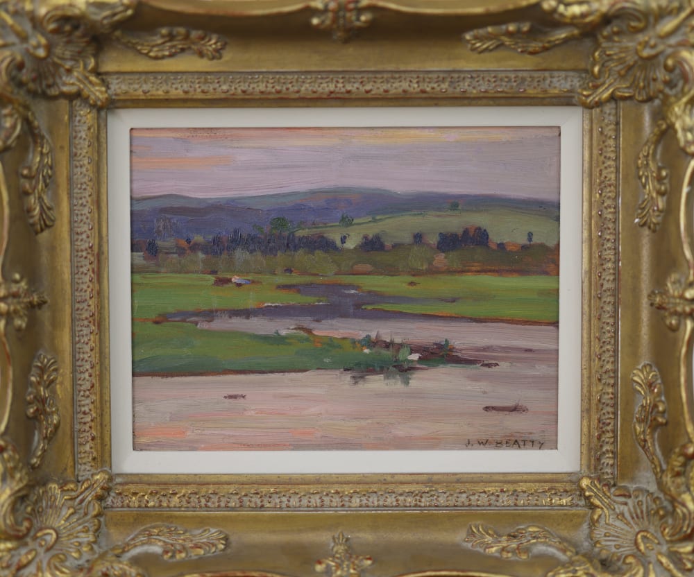 Born in Toronto in 1869, Beatty trained first with his father and later with artists George Agnew Reid, William Cruikshank, and F. M. Bell-Smith before continuing his studies at the Académie Julian in Paris. Returning to Canada, he became a teacher at the Ontario College of Art and a central figure among painters of his generation. Works such as Sunset show why he was respected not only for his role as a teacher but also for his ability to find atmosphere and meaning in even the smallest of panels. This oil on panel measures 7 x 8.5 inches and is signed on the bottom right.