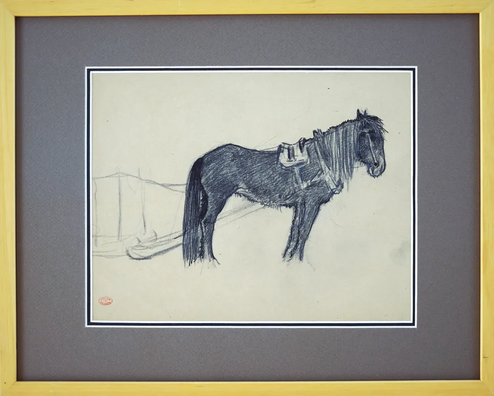 Clarence Gagnon’s Cheval et Traîneau is a spare, intimate drawing that centres on a sturdy workhorse standing in profile, harnessed to a lightly sketched sleigh behind it.