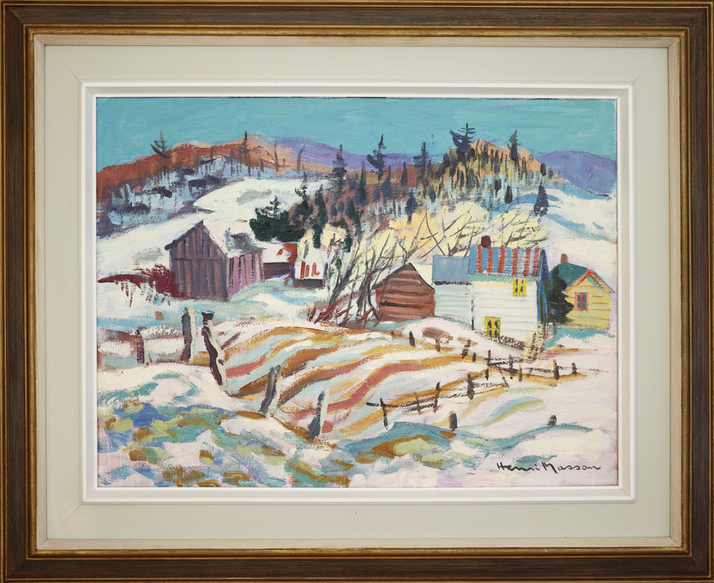 March, Rupert, Quebec by Henri Masson is an 18 x 24 inch oil on canvas that was produced in 1978 and signed in the bottom right corner. This vibrant landscape depicts a winter scene from rural Quebec. Simple structures line a snow-covered hill that is dotted with wooden fence poles and patches of pine trees.