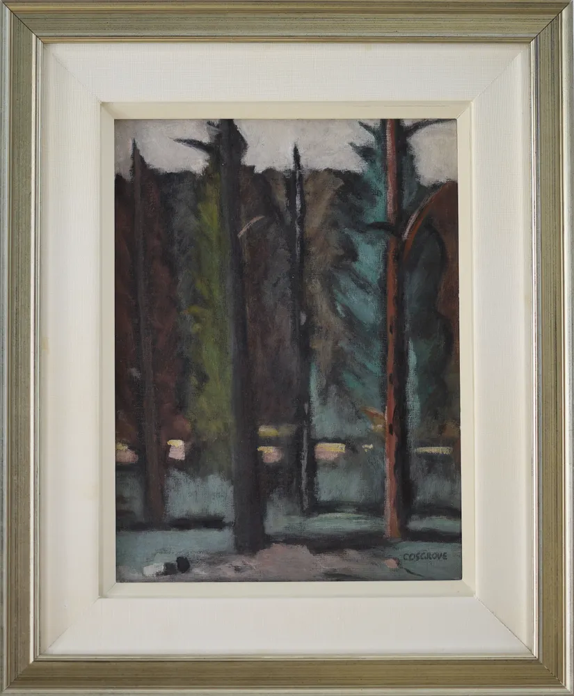 Stanley Cosgrove’s Four Trees is a moody forest interior built from a screen of tall, slender trunks set close to the picture plane. The composition is dominated by vertical bands of brown, black, olive green, and blue-green, with the trees rising against a pale, overcast sky. Between them, Cosgrove suggests dense, shadowed foliage and undergrowth rather than a fully open landscape, so the space feels enclosed and quiet.