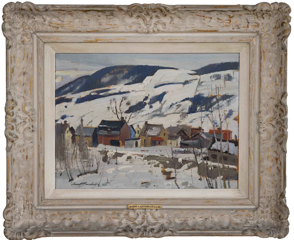 The painting has an overall muted color palette, with occasional splashes of color that bring life and vibrancy to the scene. This artwork is a testament to Bouchard's ability to capture the subtle beauty of the Canadian landscape during a time of seasonal change.