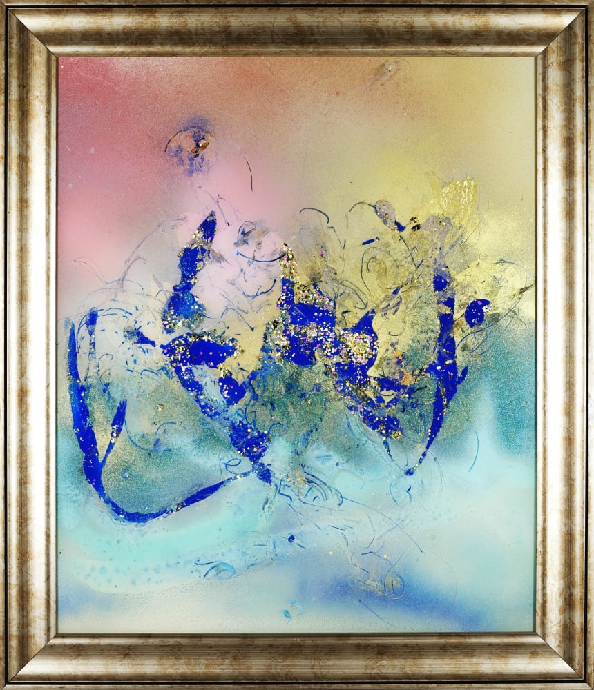 Tangled in the Blue, 2025 mixed media on reverse glass panel measures 24 x 20 and is signed on reverse.Provenance