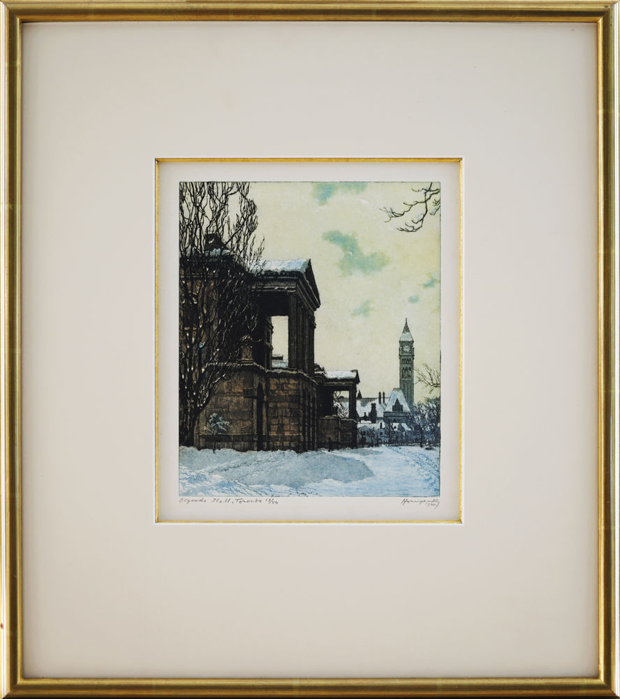 Hornyansky also taught printmaking and metal-plate techniques at the Ontario College of Art (now OCAD University) and Central Technical School, influencing generations of Canadian printmakers and contributing to the development of graphic arts education. He was a member of the Royal Canadian Academy of Arts (Associate), the Ontario Society of Artists, and served as president of the Society of Canadian Painter-Etchers and Engravers, playing an important role in promoting printmaking as a professional discipline. His prints are celebrated for their technical precision, architectural clarity, and historical documentation of Canadian urban life in the early 20th century, and remain highly sought after in both public and private collections. This aquatint on paper is protected by museum glass, measures 7 × 5.8 inches, and is signed bottom right.