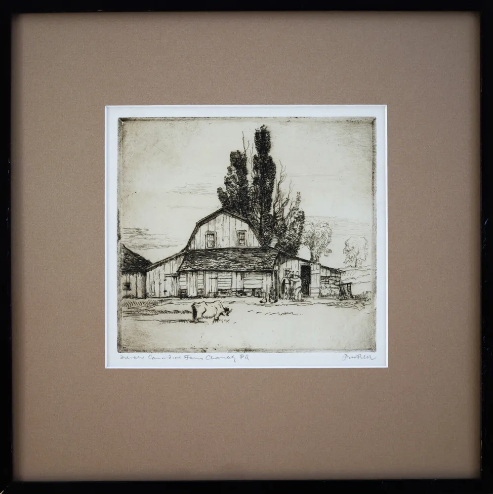The work has a restrained, intimate feeling. Pilot uses delicate linear detail to describe the boards of the buildings, the shingles on the roof, and the sparse textures of the ground, while leaving large areas of open sky and yard relatively bare. That contrast gives the farm a sense of stillness and space. A small cow in the foreground and a farmer with his horse near the doorway add life without disturbing the quiet mood.