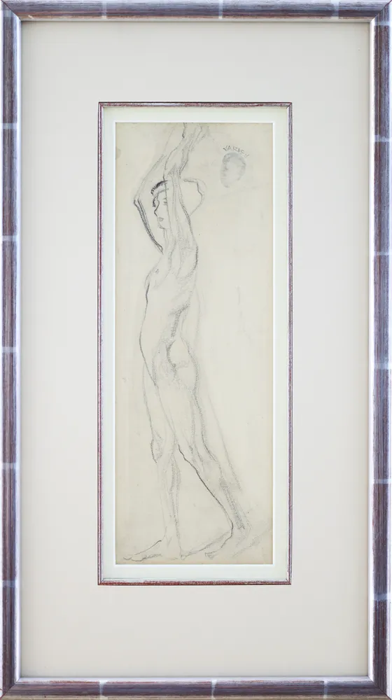 Much of the surrounding paper remains untouched, giving the drawing an airy openness that emphasizes the elegance of the pose. The faint inscription “Varley” near the upper right further reinforces the sense that this was a quick observational study, likely produced during a life drawing session in which Varley focused on gesture, balance, and the essential structure of the human figure rather than detailed finish.