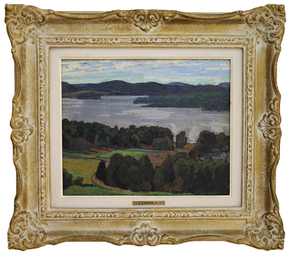 L.A.C. Panton’s Lake of Bays from Lookout Point, Dorset, c. 1930 is an oil on board measuring 9 x 11 inches. Painted from a high vantage overlooking Lake of Bays, a popular and scenic waterway in Ontario’s Muskoka region known for its forests, rocky outcrops, and shimmering lakes, the work captures the beauty of the land and water. Panton’s brushwork and thoughtful colour harmonies draw the viewer into a moment of early‑20th‑century Canadian wilderness.