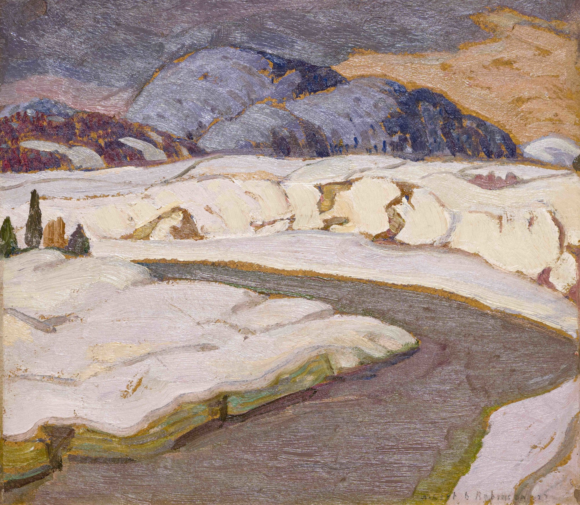 From roughly 1918 through 1933, Robinson embarked on more painting trips along the St. Lawrence River and into the Laurentian Mountains, often accompanied by A. Y. Jackson, Clarence Gagnon, Edwin Holgate, and Randolph Stanley Hewton. He would also exhibit frequently with them. Jackson and Robinson explored Quebec’s Charlevoix region together often, a landscape that inspired both artists and became closely associated with Robinson’s legacy. Although not a formal member of the Group of Seven, Robinson shared their commitment to depicting distinctly Canadian landscapes and was friends with many of the members. Springtime in the Hills, 1927, oil on canvas by Albert Henry Robinson