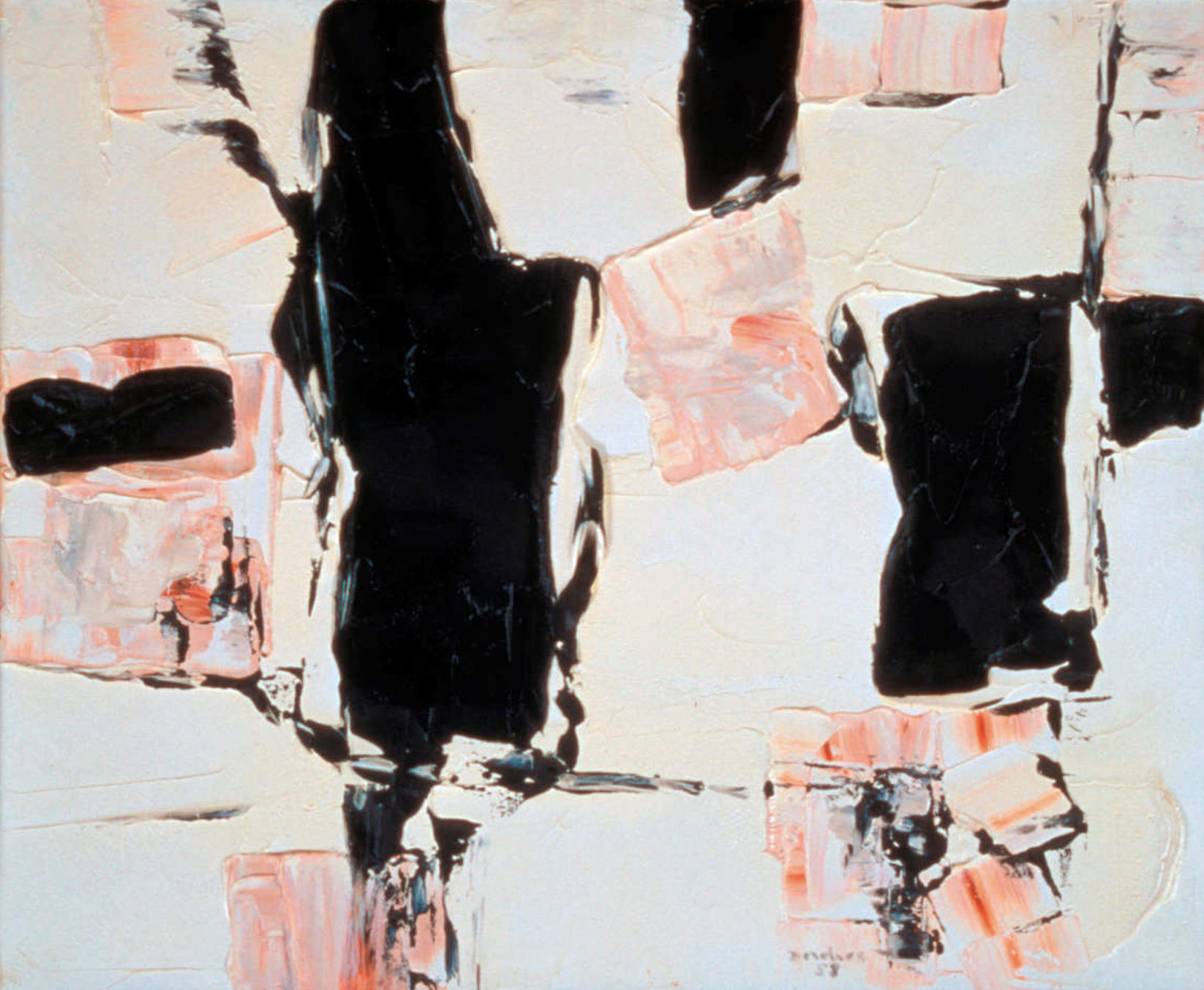 Undeterred, Borduas continued to paint throughout the 1950s, increasingly embracing abstraction. His works from this period are characterized by non‑representational forms, expressive brushwork, and subtle harmonies of tone and colour, which was a dramatic shift from his earlier figurative and landscape work. This evolution reflected his belief that painting could function as a spiritual and intellectual inquiry, not just a depiction of the visible world.