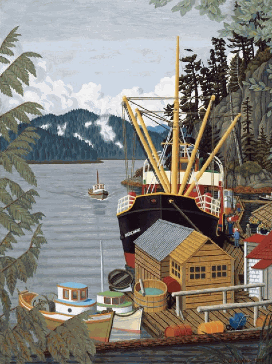Hughes developed a distinctive style which is characterized by flattened perspectives, crisp outlines, and a graphic approach to British Columbian landscapes. He was considered a master of “observational realism,” a term coined by his official biographer, Robert Amos, after struggling to find a more precise way to describe Hughes’s unique artistic skill.