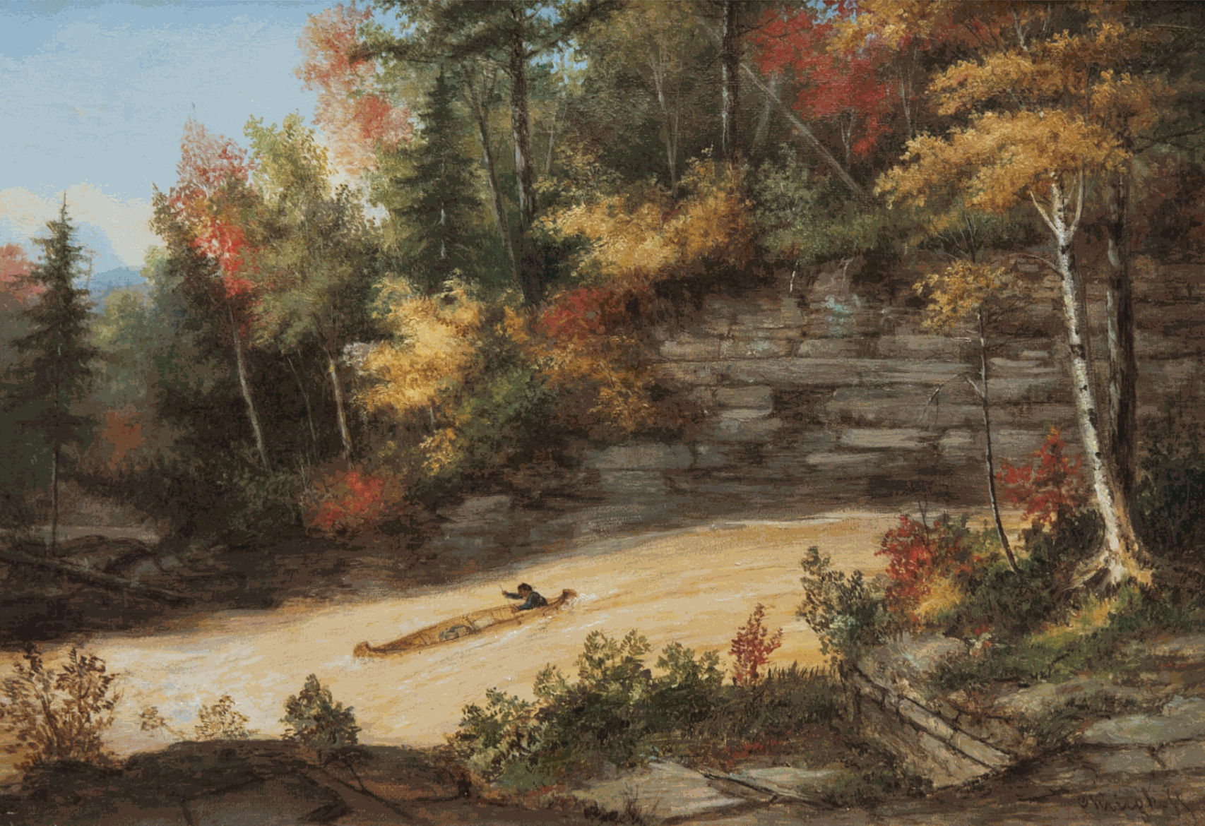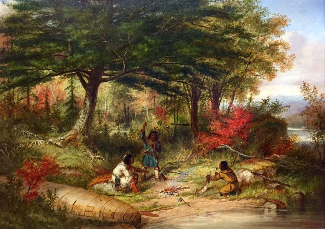 Krieghoff returned to Montreal and lived there between 1846-1853, where he developed a connection with the Mohawk community at the Kahnawake reserve, creating numerous sketches that he used as the basis for oil paintings. He painted men heading out to hunt, women traveling to market, often on snowshoes, and people dressed in toques and blanket coats, sometimes pulling toboggans. He also created summer scenes that featured campfires, birchbark canoes along the shoreline, cooking kettles, wigwams, and dogs, all set against forested backdrops. Krieghoff faced significant financial hardship in Montreal. His genre scenes of French-Canadian life did not appeal to wealthy urbanites, and he often went door-to-door offering paintings for $5–10. To make ends meet, he sometimes worked as a housepainter. In 1851, he met John Budden, an auctioneer who begins buying and promoting Krieghoff’s work.