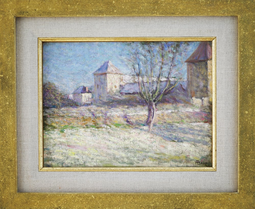 Henri Beau’s Whispers of Spring presents a soft, atmospheric view of rural architecture emerging from winter’s last pale veil. In the foreground, a slender tree rises from a sun-washed field...Henri Beau’s Whispers of Spring presents a soft, atmospheric view of rural architecture emerging from winter’s last pale veil. In the foreground, a slender tree rises from a sun-washed field where melting snow and early shoots mingle in tones of lavender, rose, and pale green. The middle distance is anchored by square, turret-like buildings whose warm stone walls catch the filtered spring light. Beau’s feathered, Impressionist brushwork—alive with lilac, cream, and icy blue—creates a shimmering haze that gently blurs edges and invites the eye to wander.