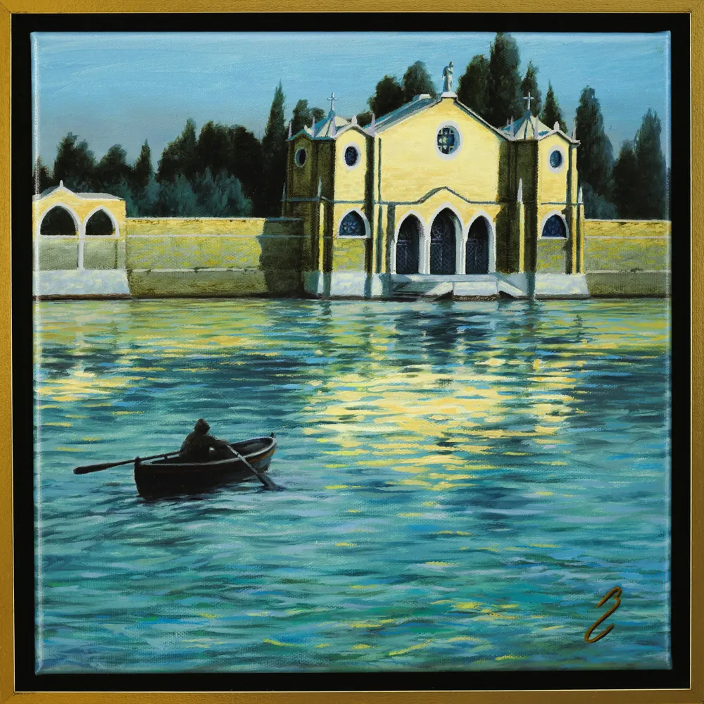 In this view of the Island of St. Michael, Venice, Bruno Capolongo presents the small church and enclosing wall as a luminous, almost dreamlike presence rising directly from the lagoon....In this view of the Island of St. Michael, Venice, Bruno Capolongo presents the small church and enclosing wall as a luminous, almost dreamlike presence rising directly from the lagoon. The pale yellow facade catches the light and glows against the dark screen of trees behind it, while the cool blue-green water fills most of the composition with shimmering reflections. In the foreground, a solitary rower in a black boat introduces a note of quiet human scale, emphasizing the stillness and distance of the island beyond.
