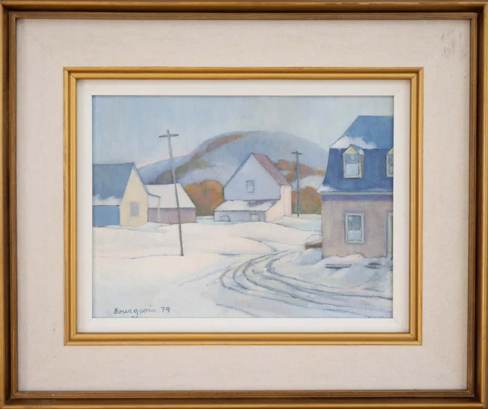 In "Deep in Winter" by Denis Bourgeois, the viewer is transported to a quiet village tucked away in the snowy landscape. Each house in the painting has its own unique architectural style and coloring, creating a charming and diverse community. The snow-covered ground and rooftops create a peaceful atmosphere, with tire tracks weaving through the composition. Soft light illuminates the scene, casting gentle shadows that reveal the low angle of the winter sun. The color palette is dominated by cool blues and whites, with hints of warmth from the bare trees and houses. Vertical power lines and poles add a sense of structure and contrast to the horizontal lines of the horizon and homes. This artwork captures the simplicity and serenity of small-town life during wintertime. Bourgeois' signature and the year '79 are included, marking the creation of this beautiful piece.