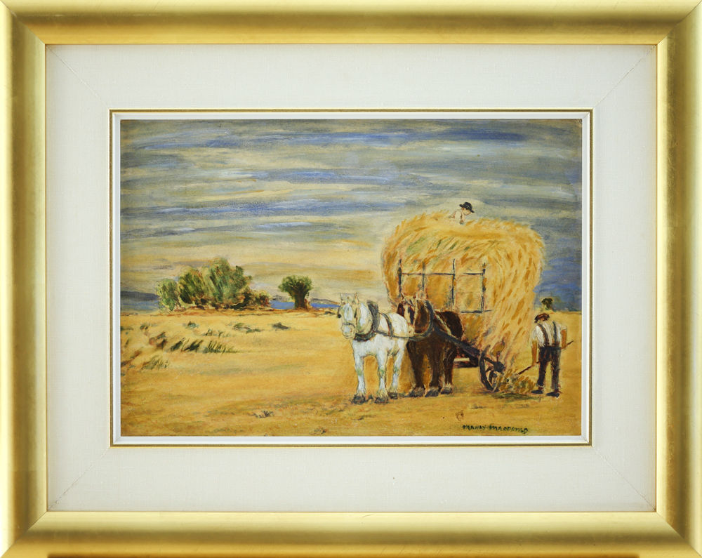 Near Lake Simcoe by Manly MacDonald is a 10.25 x 15 inch oil on board produced circa 1930 and signed in the bottom right corner. The piece depicts a horse drawn cart laden with hay. Two men wearing hats and suspenders work vigorously, piling golden straw. The sky is painted in blue and yellow waves, adding movement to the piece.